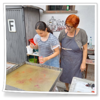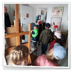 Am 29. März 2022 war es dann so weit. Um kurz nach 10 Uhr traf die kleine Gruppe bei uns am „Schermerhof“ ein. Für die Besichtigung hatten sich die Künstlerin Deta Hannaneh und der Künstler Helge Ebling gerne die Zeit genommen um vor Ort anwesend zu sein. Gabi Götz hatte die Räume vorbereitet und war anfangs ebenfalls anwesend. Nach einer kurzen „gegenseitigen“ Vorstellung ging es zu einer ersten Kurzbesichtigung des Künstlerhauses. Schon da merkte man das Interesse und die Begeisterung der Kinder für die Kunst.