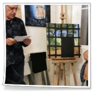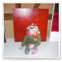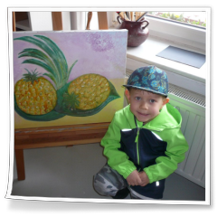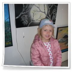 Inzwischen war die zweite Gruppe auf Erkundung im Künstlerhaus unterwegs. Es war für Helge Ebling faszinierend, was die Kinder in den Bildern, der sechs im Künstlerhaus tätigen KünsterInnen, alles von sich aus sahen und entdeckten, was selbst vielen Erwachsenen entgeht. Auf Nachfragen zu den Bildern kamen kluge Antworten, man merkte daran, dass sie sich in der Kita schon einige Zeit mit Kunst beschäftigt hatten und die Erzieherinnen können stolz darauf sein, was ihre Schützlinge davon alles aufgenommen haben. Jedes der Kinder konnte sich dann noch vor seinem „Lieblingskunstwerk“ im Künstlerhaus fotografieren lassen, wobei die Wahl oft schwer fiel, da es meist mehrere Lieblingskunstwerk gab ;-)