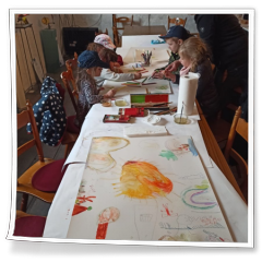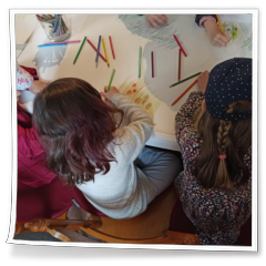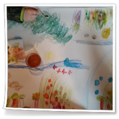 Deta Hannaneh hatte die Idee, dass die Kindern ein gemeinsames Aquarellbild mit Aquarellstiften auf ein großes Blatt Papier malen könnten. Sofort waren die Kinder mit Begeisterung dabei, jedes hatte eine Ecke für sich bekommen und die ersten Motive waren schnell zu erkennen. Mit Hilfe von Wasser wurde aus den Strichen weiche Konturen und fließende Übergänge und die Aquarellstiften waren eindeutig „Zauberstifte“ ;-) Am Ende kam ein gemeinsames Kunstwerk zustande.